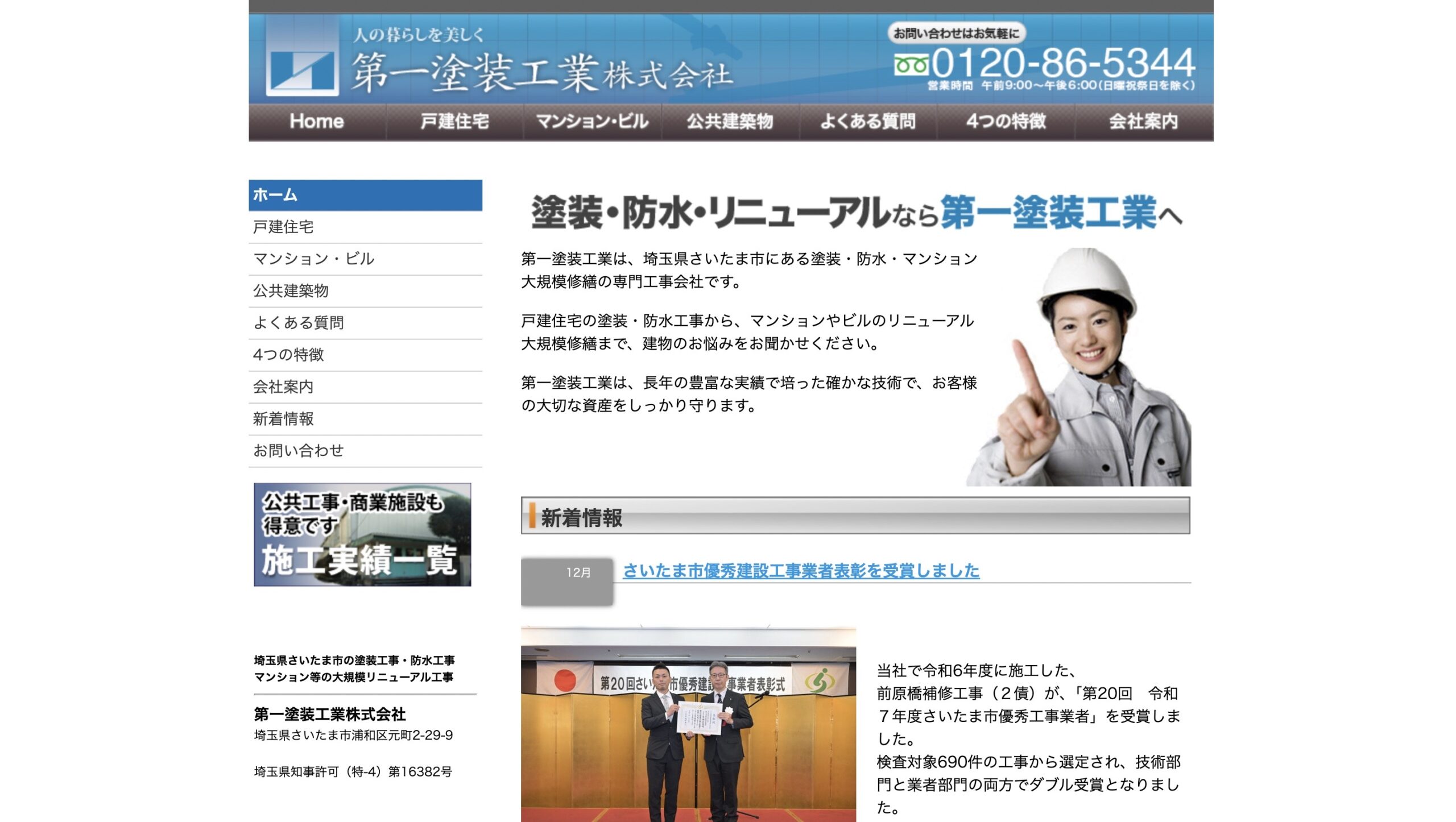 第一塗装工業株式会社は埼玉県さいたま市浦和区を拠点に、マンション・ビルなどの大規模修繕工事をはじめ、建物全般の改修・リニューアル工事を手がけている施工業者です。