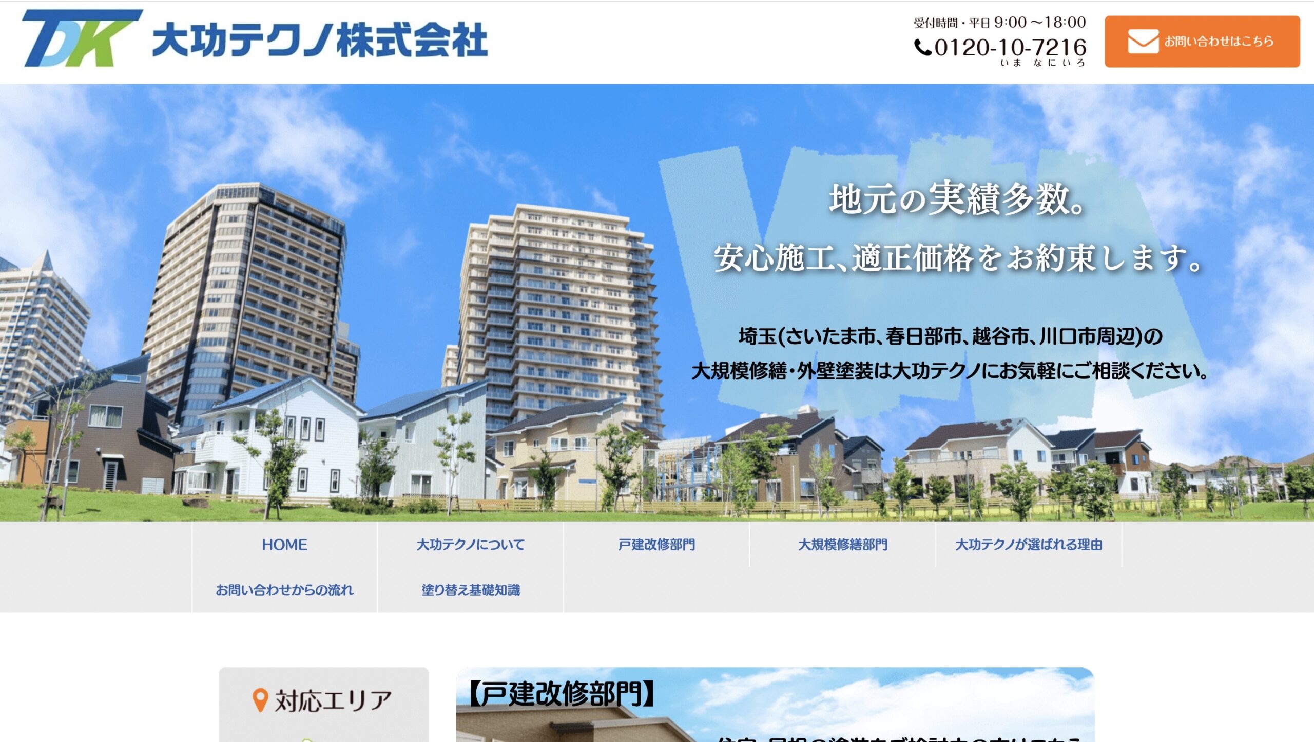 大功テクノ株式会社は埼玉県さいたま市岩槻区を拠点に、マンション・ビルなどの大規模修繕工事をはじめ、建物全般の改修・リニューアル工事を手がけている施工業者です。
