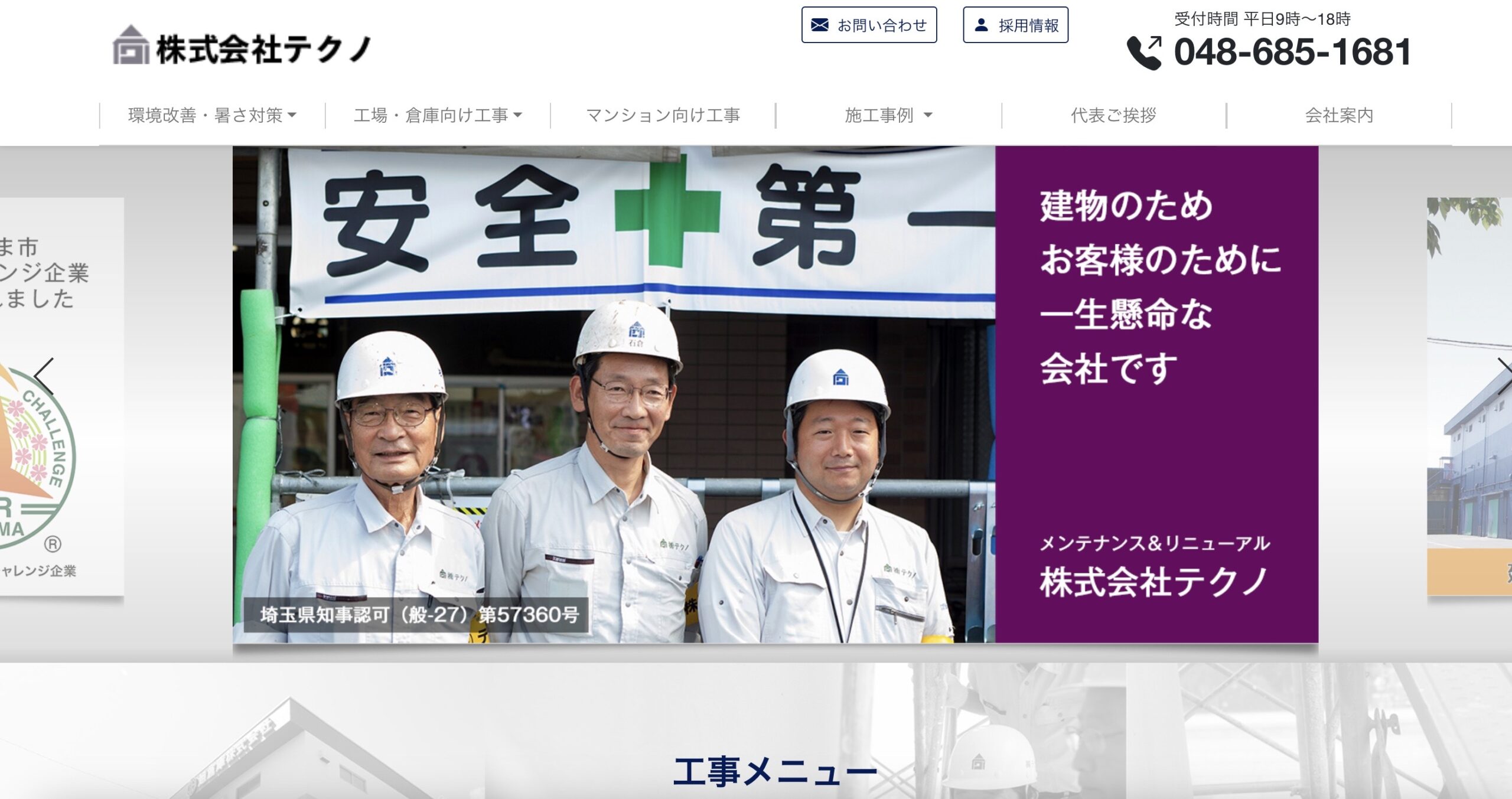株式会社テクノは埼玉県さいたま市見沼区を拠点に、マンション・ビルなどの大規模修繕工事をはじめ、建物全般の改修・リニューアル工事を手がけている施工業者です。