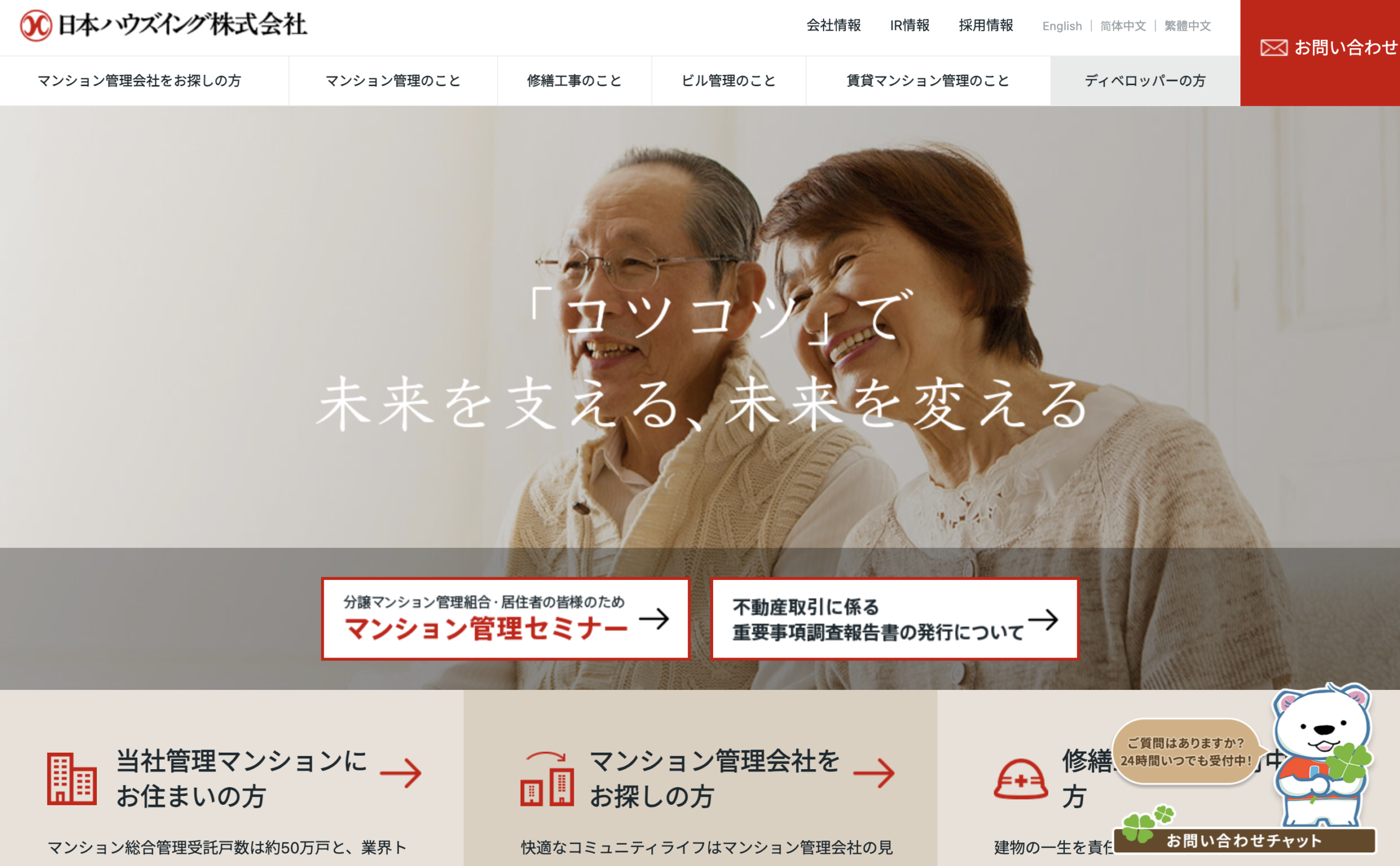 日本ハウズイングは東京都新宿区を拠点に、マンション・ビルなどの大規模の管理を行っている会社です。
