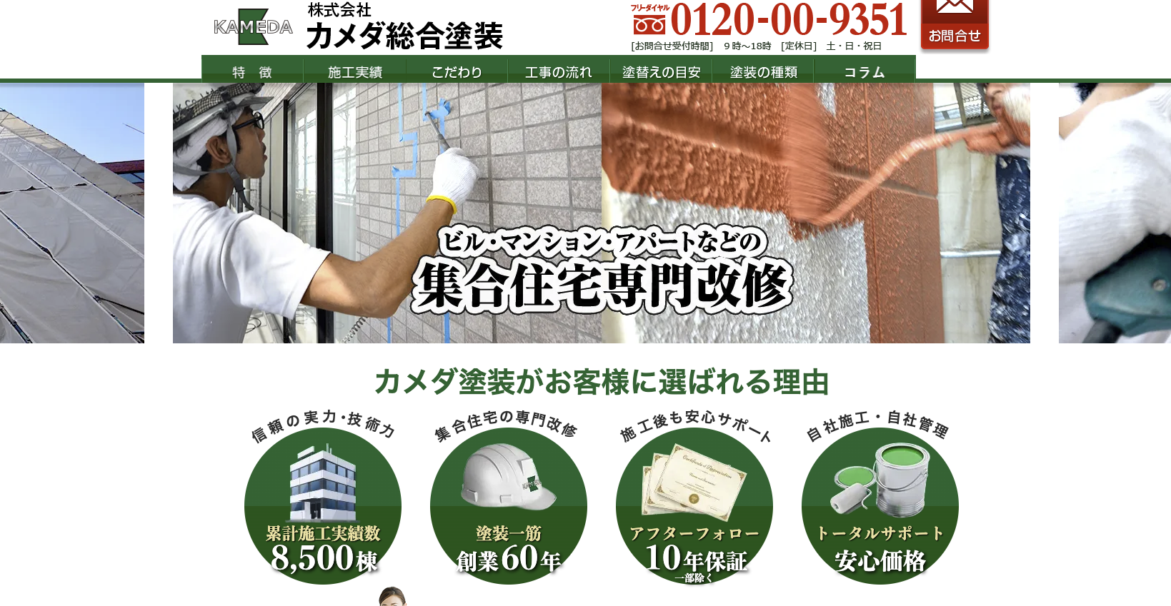 カメダ総合塗装は千葉県松田市を拠点に、マンションなどの大規模修繕工事をはじめ、ビル・アパートや一戸建て住宅など、建物全般の改修・リニューアル工事を手がけている施工業者です。