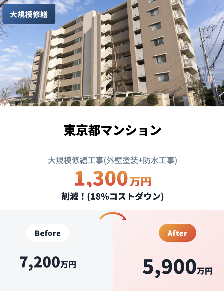 • 他社7,200万円→5,900万円(東京都のマンション修繕)※19%の減額で1,400万円お得に