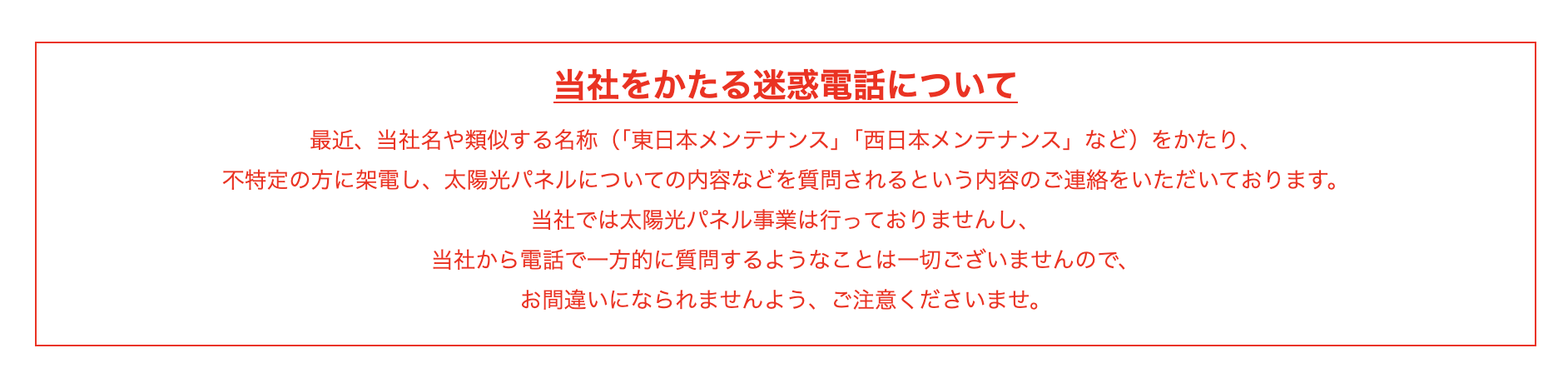 日本メンテナンスのHPにも記載されていますが、日本メンテナンスではない会社が「東日本メンテナンス」「西日本メンテナンス」などを語り、不特定の方に家電をし、太陽光パネルについての内容などを質問しているという現状があります。