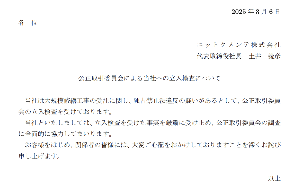 ニットクメンテ株式会社は、2025年3月6日に公正取引員会による独占禁止法違反の疑いの立入検査を受けています。