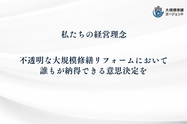 私たちは【不透明な大規模修繕リフォームにおいて誰もが納得できる意思決定を】という理念を掲げて日々活動を行っております。