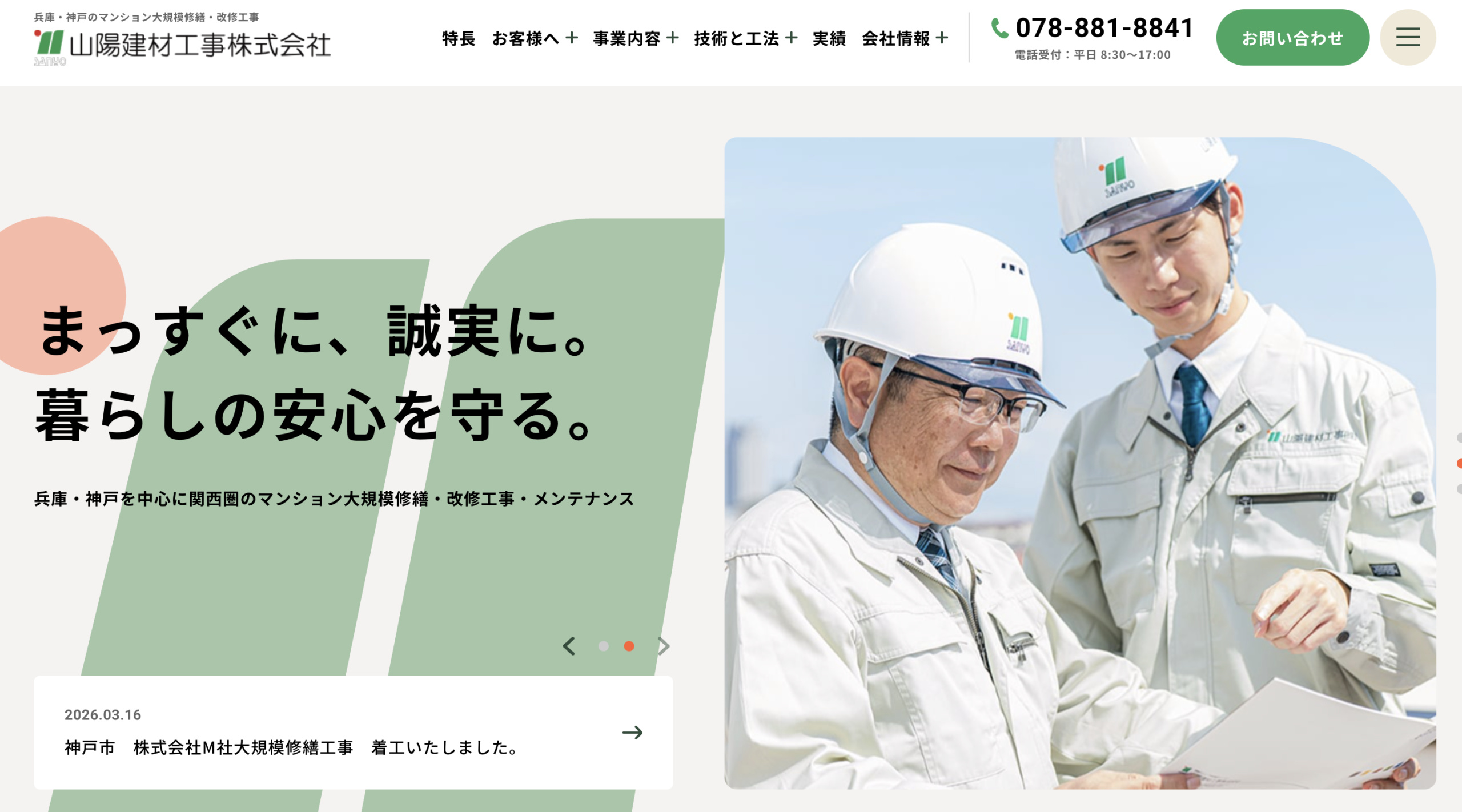 山陽建材工事株式会社は兵庫県を拠点に、マンション・ビルなどの大規模修繕工事を中心に手がけている施工業者です。