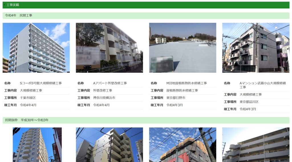 「大規模修繕の業者選びで失敗しないコツ」でもお伝えしているように、施工事例の数は業者選びにおける大切な要素の1つとなります。